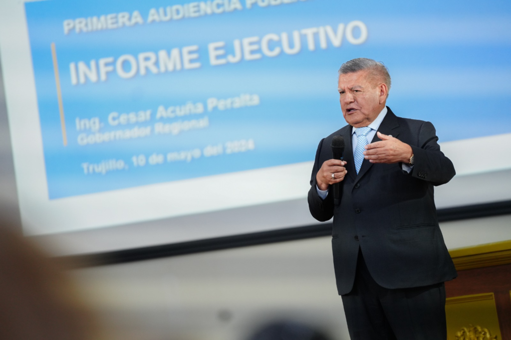 El gobernador César Acuña, durante la Primera Audiencia Pública Regional de Rendición de Cuentas del GORE La Libertad para el año fiscal 2024, declaró que “estamos cumpliendo con el compromiso de hacer obras para mejorar la calidad de vida de los liberteños, garantizando cero corrupción, al ejecutar de manera transparente los presupuestos en gastos corrientes y de inversión”.