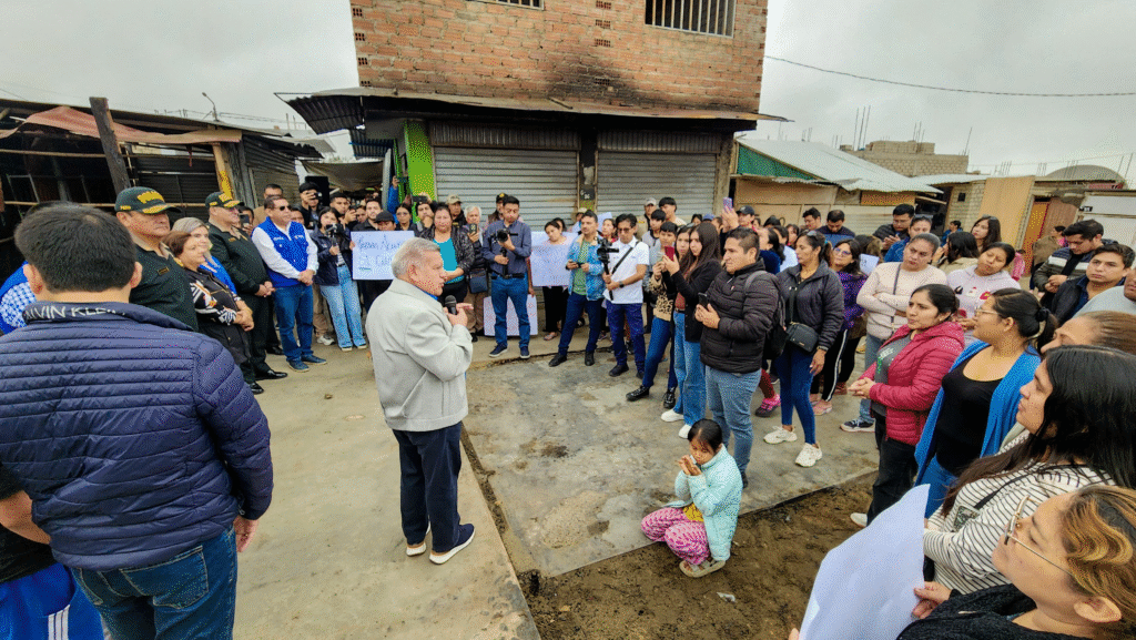 El gobernador regional de La Libertad, César Acuña, llegó al mercado Dulce Amanecer, en el distrito Alto Trujillo, que hace poco sufriera la destrucción de sus puestos de venta, a raíz de un incendio provocado por extorsionadores. Les ofreció el soporte necesario para que puedan recuperarse y vivir tranquilos.