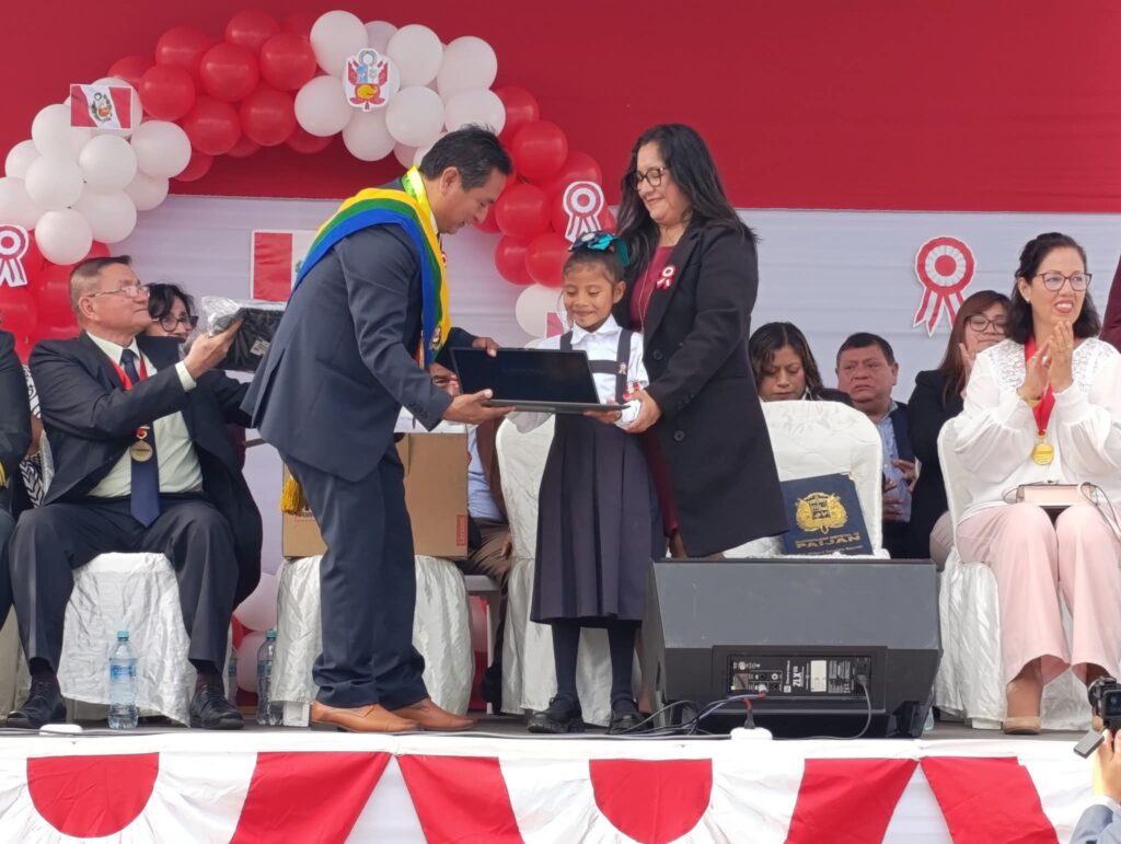 En el marco de la ceremonia por el 204.º aniversario de la independencia del Perú, realizada en la Plaza de Armas de Paiján, el alcalde distrital Richard Zavaleta, junto a su esposa, entregó una laptop a la niña Kristell Ávila Ortiz y una resolución de alcaldía, en mérito a su destacada interpretación del Himno Nacional en quechua, que ha proyectado el nombre de Paiján más allá de nuestras fronteras.