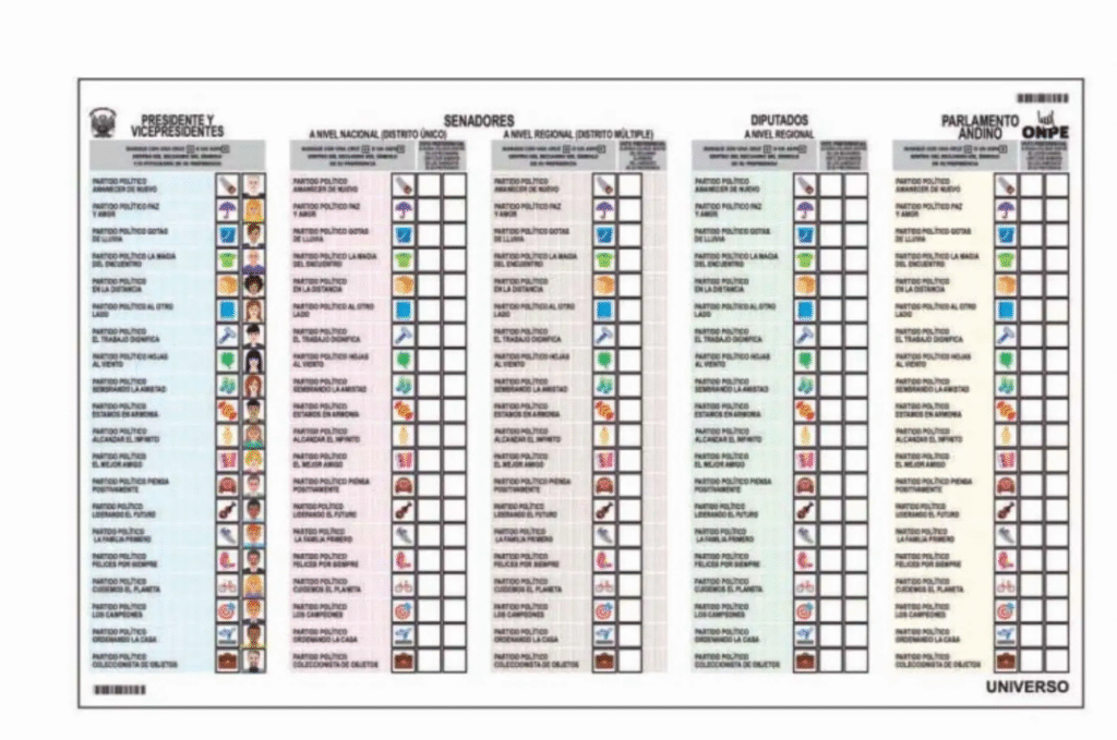 La papeleta electoral contará con cinco columnas, cada una representa una elección distinta: fórmula presidencial, senadores a nivel nacional, senadores a nivel regional, diputados y representantes ante el Parlamento Andino.