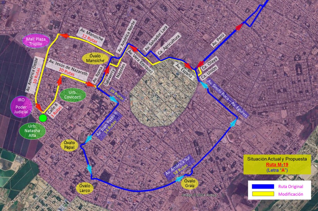 La modificación de ruta implica ir por av. Perú, España, calle Agricultura, Salvador Lara, América y óvalo Mansiche. El cambio se produce por avenida Mansiche, América Oeste y cruce con Calle 8, para retornar por Covicorti, Jesús de Nazareth, av. Roma y Nápoles para retornar por su mismo recorrido, pero en sentido contrario.